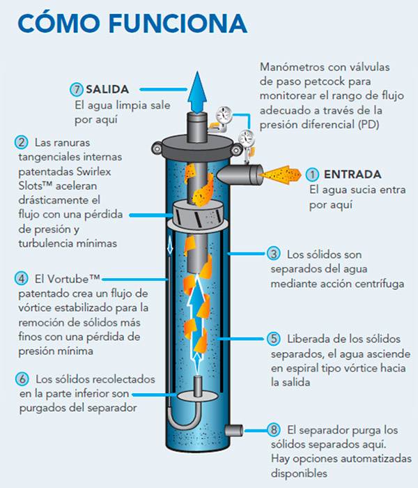 Los separadores crean una acción centrífuga al inducir agua tangencialmente en un barril de separación creando una acción similar a un vórtice (1). La rápida acción de giro creada por el vórtice hace que las partículas más pesadas se separen hacia la parte exterior del cilindro (3). El líquido separado fluye hacia el centro del vórtice, donde la presión es baja, y sale por la salida libre de partículas y continúa hacia el equipo aguas abajo (5). La gravedad hace que las partículas separadas caigan por el cilindro exterior donde se acumulan en la cámara de purga (6).